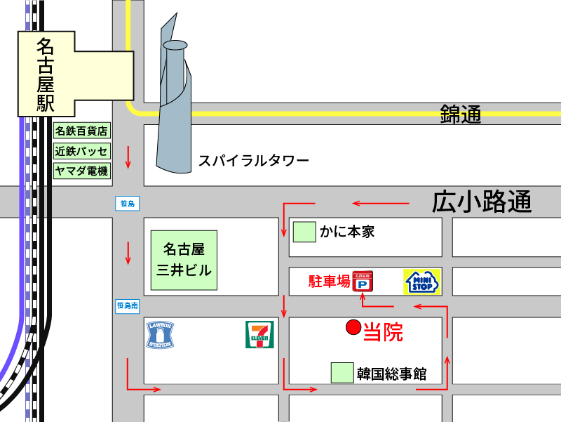 カーナビの場合住所「中村区名駅南1-19-27」で検索して下さい。